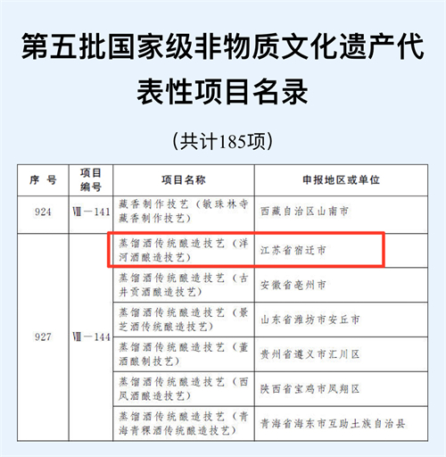 6月10日,国务院正式公布第五批国家级非物质文化遗产代表性项目名录,蒸馏酒传统酿造技艺(洋河酒酿造技艺)正式入选!