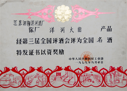 清宣统年间,洋河大曲在南洋劝业会上荣获金奖。评委张广恩在《酒类报告中》提到,“江苏以产酒著名,所产粱酒向以徐州府属之洋河镇为第一。”民国年间的《哲学辞典》也记载道:“洋河,所在居民尙制酒,以酿高粱酒名”。