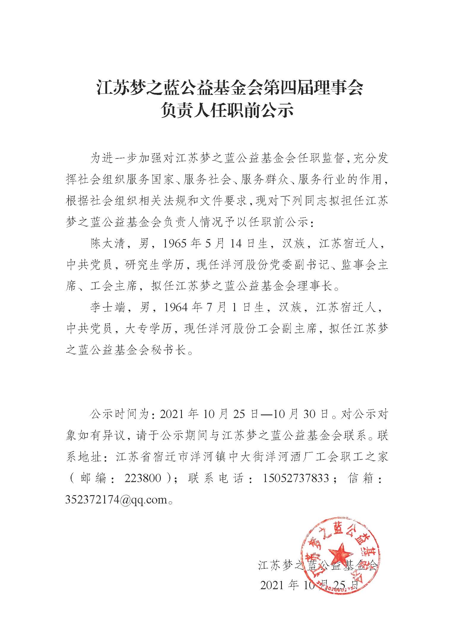 江苏梦之蓝公益基金会第四届理事会负责人任职前公示