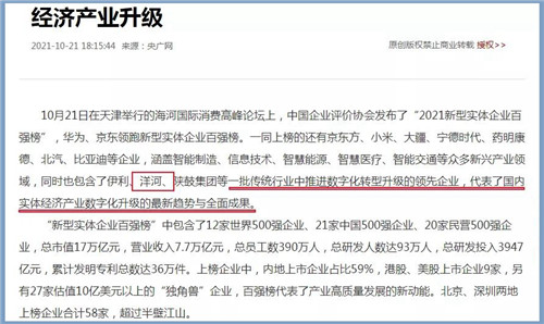 10月21日,在天津举行的海河国际消费高峰论坛上,中国企业评价协会发布了“2021新型实体企业百强榜”,洋河股份与华为、京东、小米等名企共同入选百强榜。