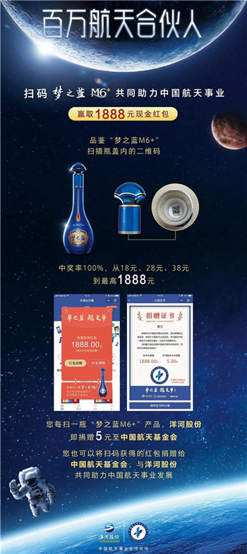在消费端,洋河通过“扫瓶盖上方二维码抢红包”等活动,激起了消费者的扫码热情。通过扫码领红包、扫码抽金条等数字化技术叠加促销的手段,与消费者形成互动,引导消费者消费习惯。最典型的案例是,作为中国航天事业的官方合作伙伴,洋河股份推出“扫码梦之蓝M6+共同助力中国航天事业”活动,与消费者一起共同助力中国航天事业发展,引发了广泛参与和好评。