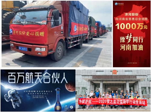 作为行业领军企业,江苏白酒的一张飘香名片,一直以来,洋河股份全力践行企业社会责任,积极助力抗震、救灾和抗疫。2020年新冠肺炎疫情袭来,洋河股份捐赠资金2200万元支援抗疫,积极参加社会公益事业,成立“中国梦·梦之蓝公益基金”、梦之蓝公益研究院,通过梦之蓝公益助学行动、梦之蓝·敬我最尊敬的人、“百万航天合伙人”等公益活动,将“基业长青”的企业梦与“伟大复兴”的中国梦紧紧联系在一起,传递“中国梦”正能量!