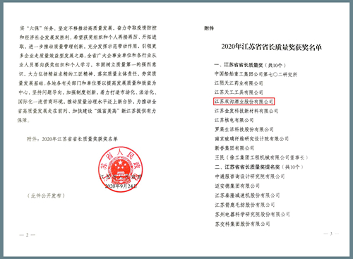双沟酒业荣获2020年江苏省省长质量奖,同时获颁2020年首批“江苏精品”企业